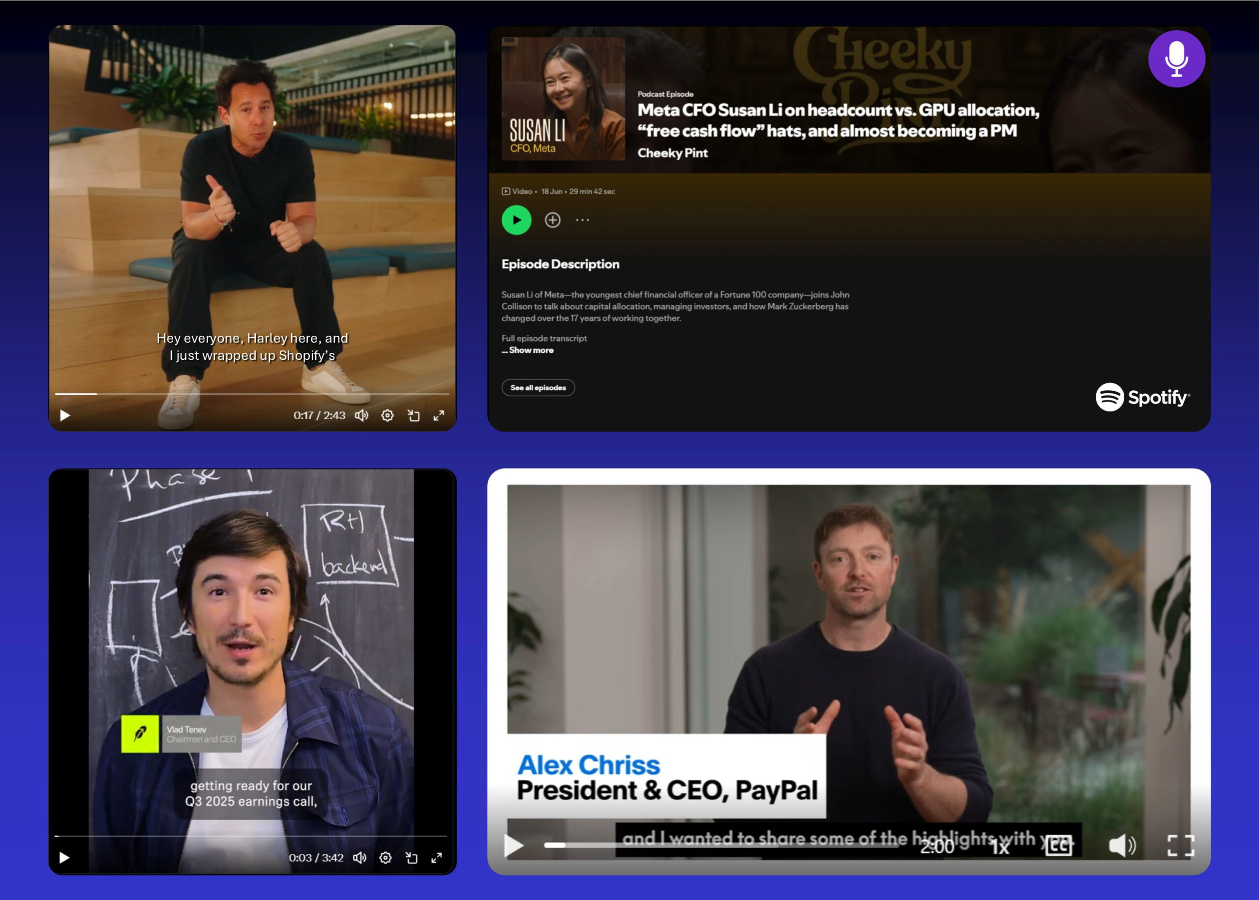 Harley Finkelstein (Shopify), Vlad Tenev (Robinhood), and Alex Chriss (PayPal) are sharing short, direct-to-camera updates that make complex results easier to follow. Finkelstein opens with “I’m back with the headlines of this quarter,” signaling continuity and accessibility. Tenev posts brief rundowns before earnings to set expectations. Chriss breaks down results in plain language, turning numbers into momentum.