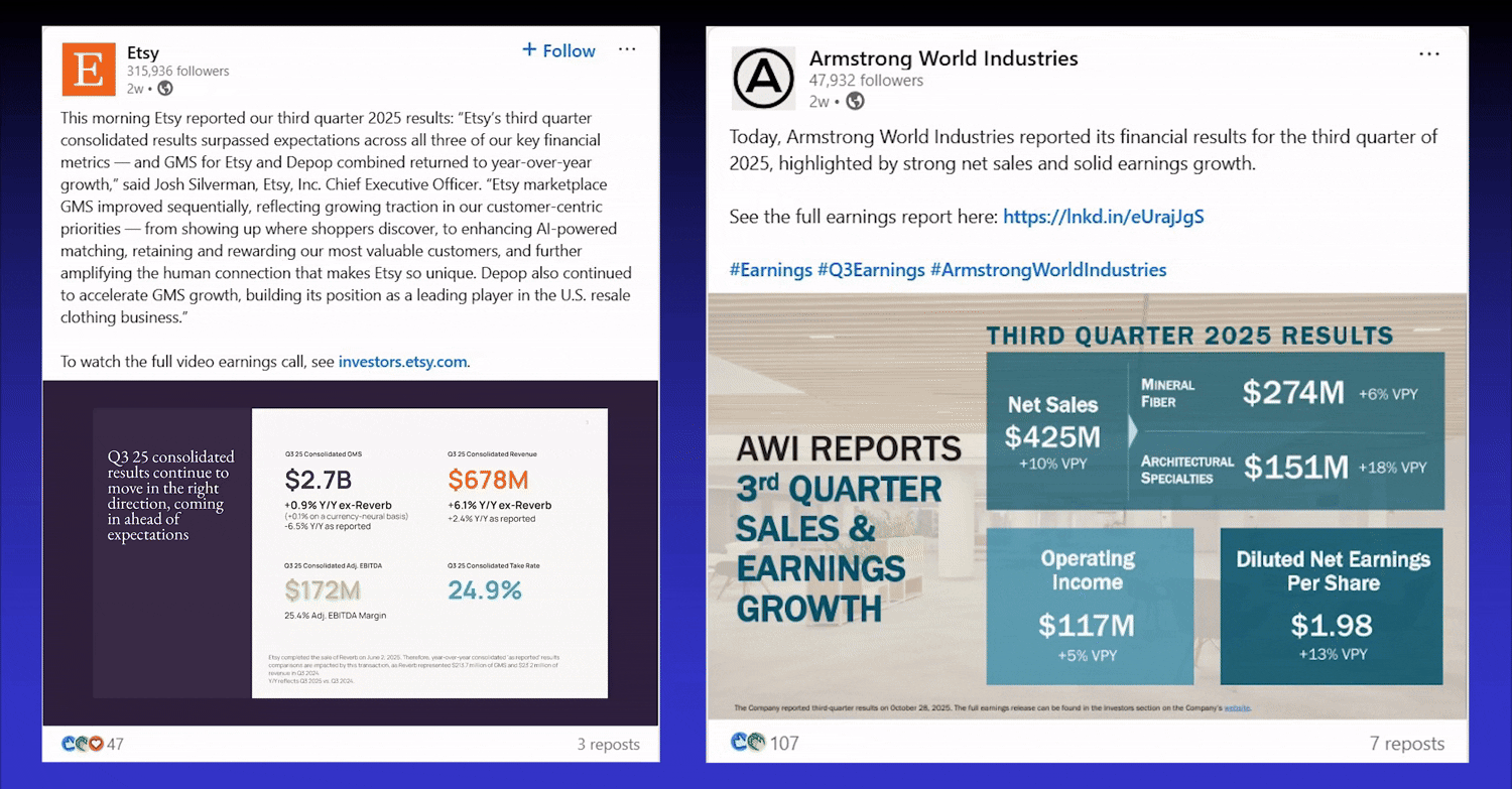 AMD summarizes its results in a LinkedIn carousel with key metrics and quotes. Honeywell posts a simple infographic highlighting growth and guidance. Etsy repackages its full earnings call into a short video featuring CEO commentary and slides. Even a PowerPoint-based graphic can do the job. A quarterly post we helped create (in PPT) for Armstrong World Industries continues to work well each quarter and drives strong engagement from employees and company followers.